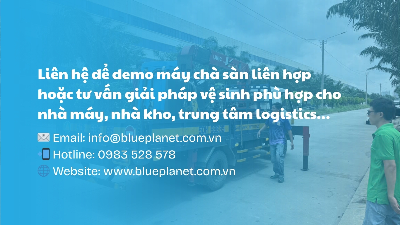 Quý khách có nhu cầu demo máy chà sàn liên hợp hoặc tư vấn giải pháp vệ sinh phù hợp cho nhà máy, nhà kho, trung tâm logistics… vui lòng liên hệ đội ngũ Blue Planet để được hỗ trợ nhanh chóng.