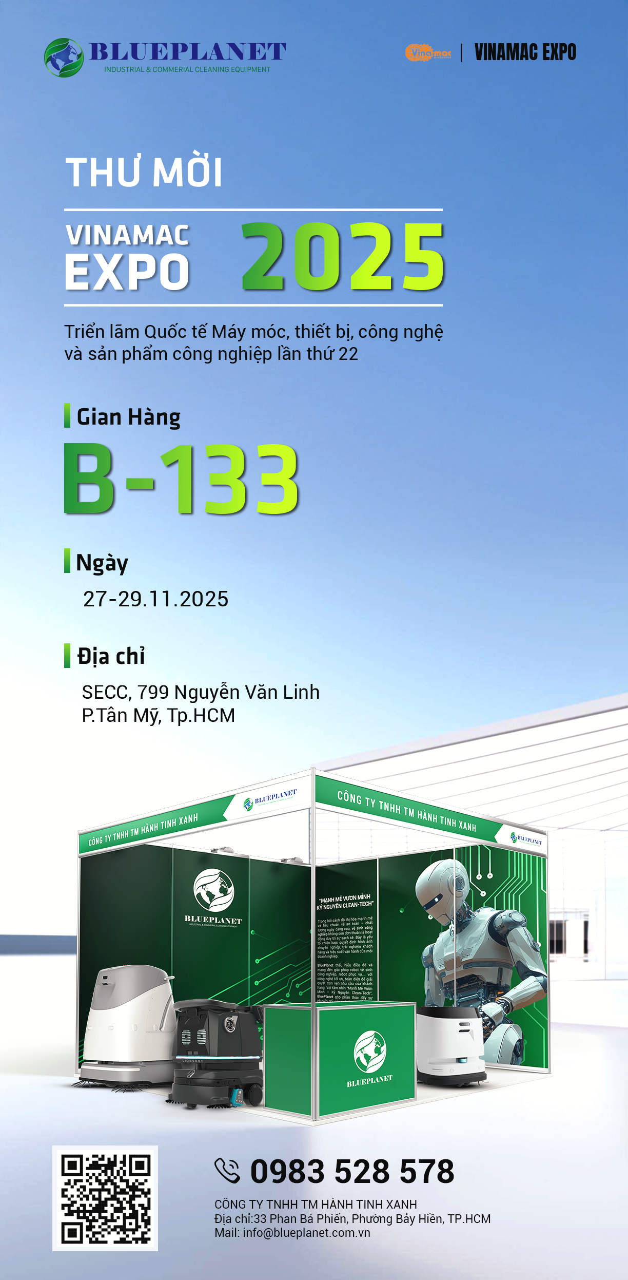 Triển lãm quốc tế VINAMAC EXPO 2025 – sự kiện uy tín về máy móc, thiết bị, công nghệ và sản phẩm công nghiệp – sẽ diễn ra lần thứ 22 tại TP. Hồ Chí Minh. Năm nay, BluePlanet chính thức góp mặt với vai trò là đơn vị cung cấp giải pháp vệ sinh công nghiệp hiện đại, mang đến nhiều dòng robot tự hành chuyên nghiệp phù hợp cho doanh nghiệp ở mọi quy mô.